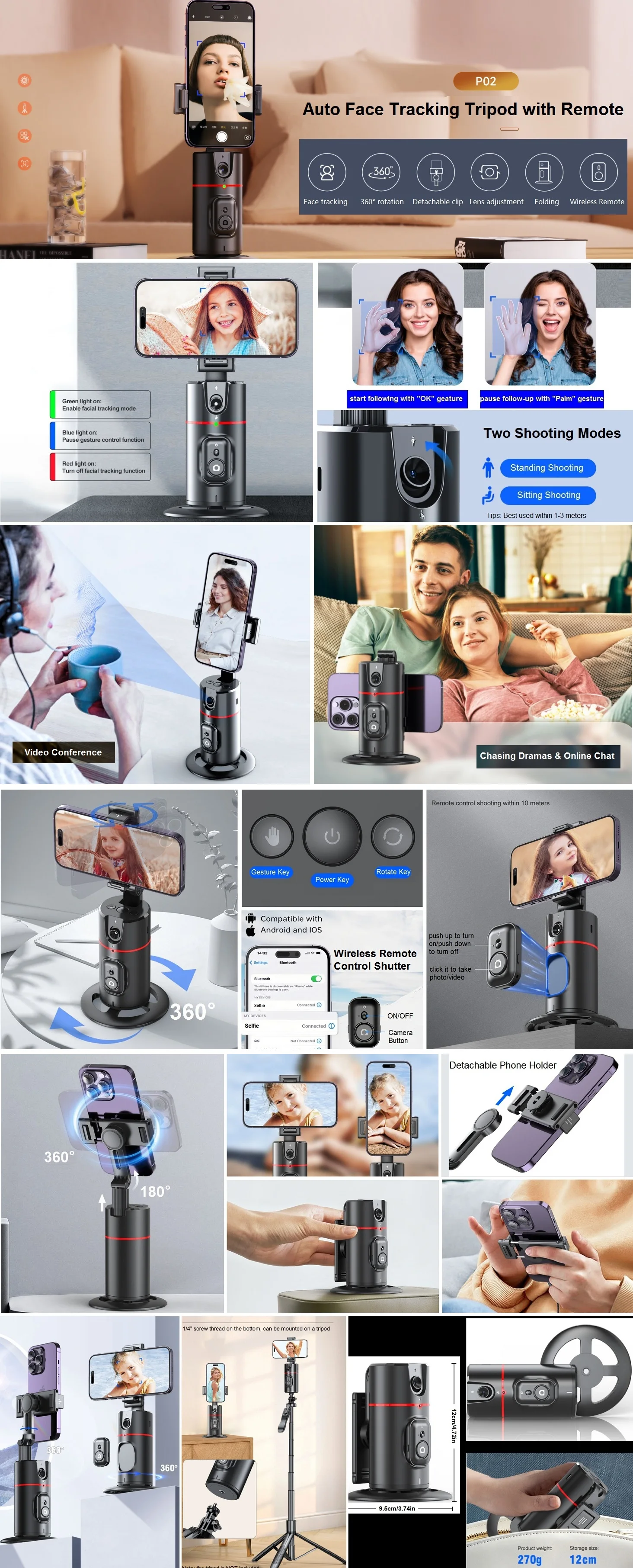 【What You Get】1 x P02 Auto Face Tracking Tripod Phone Holder, 1 x Wireless Remote, 1 x Detachable Base, 1 x Type-C USB Charging Cable, 1 x User Manual. (Pls feel free to contact us if you have any problems, we provide 30-day Full Refundand 12-month Quality Warranty).